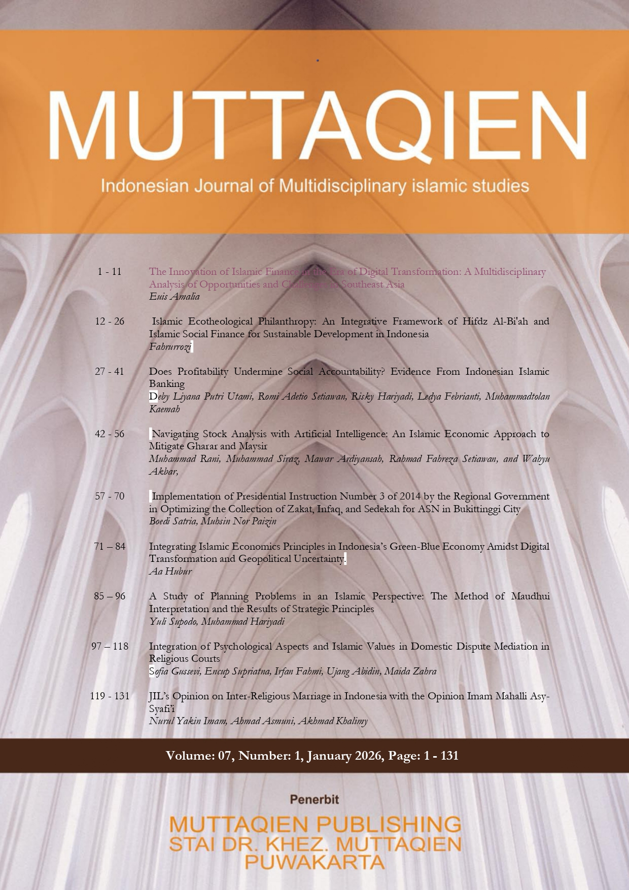 In Vol. 07 No. 1 January 2026, Jurnal Muttaqien: Indonesian Journal of Multidisciplinary Islamic Studies published nine articles written by authors from Indonesia, Malaysia, and Taiwan with diverse scientific backgrounds. This illustrates the diversity of research topics in multidisciplinary Islamic studies published by Muttaqien: Indonesian Journal of Multidisciplinary Islamic Studies. The first article was written by Euis Amalia and titled "The Innovation of Islamic Finance in the Era of Digital Transformation: A Multidisciplinary Analysis of Opportunities and Challenges in Southeast Asia." The second article, written by Fahrurrozi, was titled Islamic Ecotheological Philanthropy: An Integrative Framework of Hifdz Al-Bi'ah and Islamic Social Finance for Sustainable Development in Indonesia.